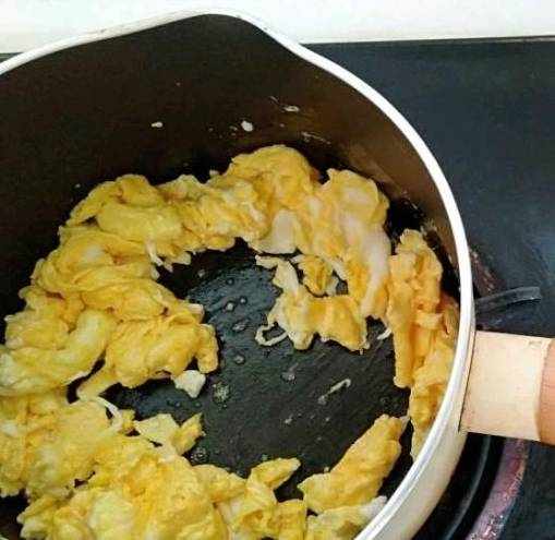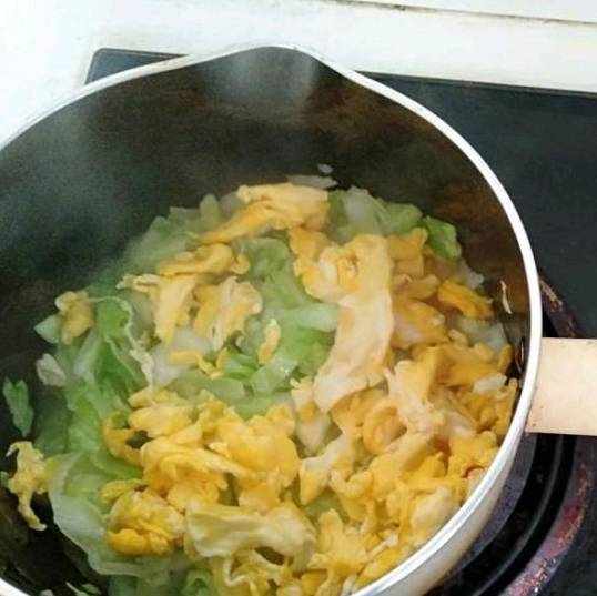 4.青菜炒熟加入鸡蛋和盐,翻炒均匀出锅