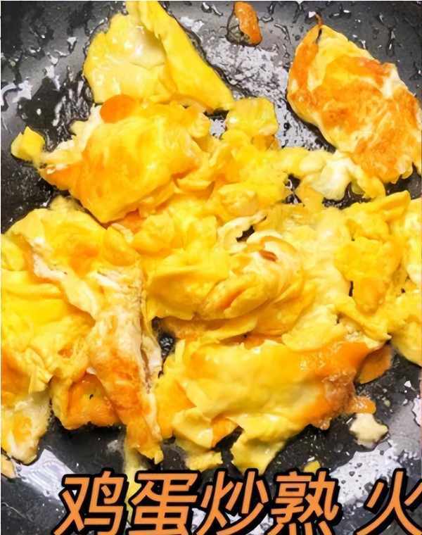 4:锅中留少许油,油温一定要烧热,记得要冷锅热油,鸡蛋液铺在锅中,开中火煎熟,等待鸡蛋快速成型,将其炒散成块状。