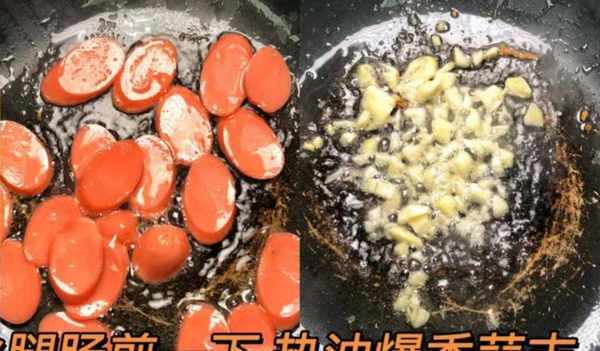5:锅中继续加上油,倒入火腿肠片,迅速爆炒一分钟,另外起锅加上食用油,加上蒜末和姜末,迅速煸炒40秒。