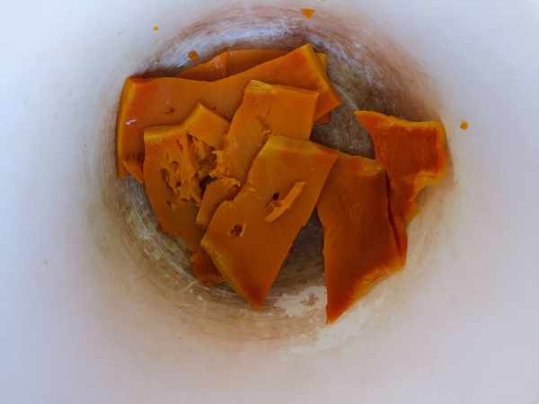 第二步:去皮切片的南瓜放入微波爐中,高火叮5分鐘,熟透拿出壓成南瓜泥。
