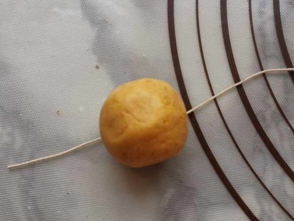 第三步:把南瓜泥中加入糯米粉和成麵團,分割成小劑子,按扁,包入豆沙餡收口,團成圓球。