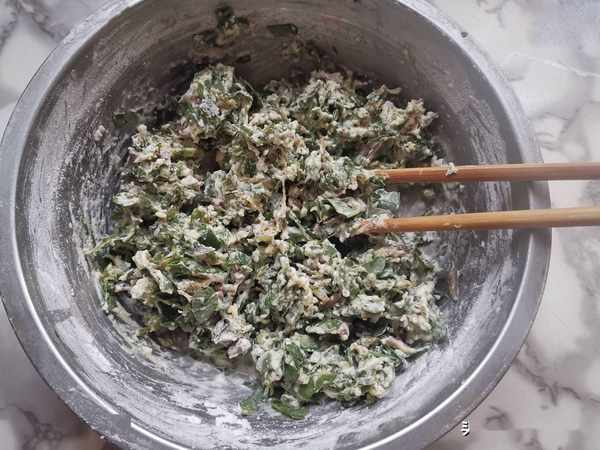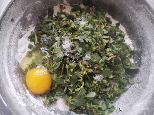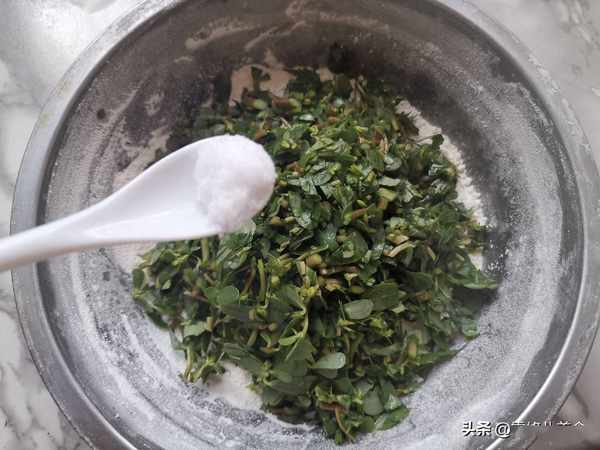 第四步:把麵粉放到盆裏,加入剁碎的馬齒莧,加入適量的鹽調味,不要太多以免太鹹了。