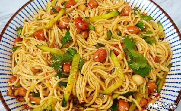 3面条开水入锅,煮熟捞出过凉水,盛入盘中,面条铺上黄瓜丝,熟花生米,香菜,搅拌均匀即可食用。