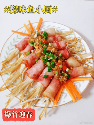 把已经烤好的培根金针菇摆入盘中,装饰些胡萝卜条,撒上肉馅,最后葱花装饰即可。烟熏培根的香气,搭配嚼劲十足的金针菇,这谁能拒绝,心动的“男神”“女神”们也快跟着小露一手吧!
