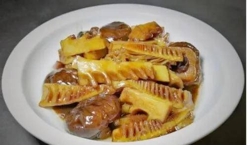 材料:鲜笋、黑酱油、干香菇、料酒、生抽、糖、香油