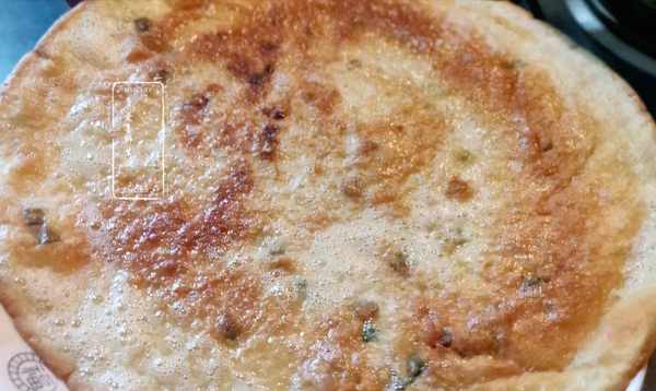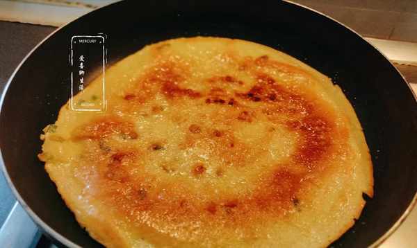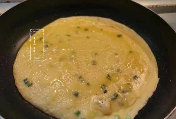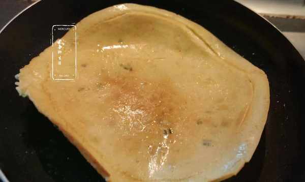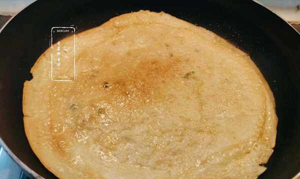 第四步,转身。面糊用中小火煎至凝固,两边稍微倾斜。沿锅边淋上少许食用油,在顶部刷上食用油,然后翻过来继续煮。