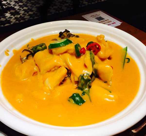 5.将炸好的鱼片放回锅中,裹上咖喱酱。