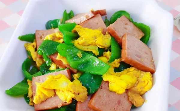 材料青椒2个,火腿200克,鸡蛋2个,姜3片,蒜3瓣,油适量,盐1勺,蚝油1勺,糖少许,胡椒粉少许
