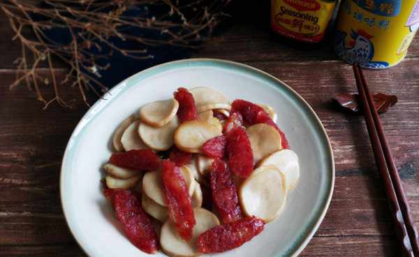 原料:杏鲍菇300克、香肠2根、花生油适量、精盐1勺、美极鲜汁适量、葱、姜各5克