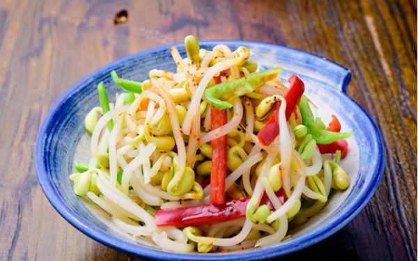 5、用勺子不断搅拌至糖和盐溶化,将焯好的青椒、灯笼椒和豆芽放入碗中,倒入调好的酱汁拌匀。