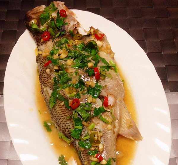 材料:鲈鱼1条(一定要现杀)、新鲜红辣椒3-4个、大蒜6瓣、姜1大块、小葱4粒、鱼露3汤匙(约50克)、柠檬1个、3汤匙鸡汤,约50克;