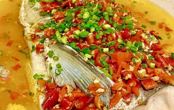 锅中烧油,放入蒜末、剁椒酱、蚝油炒香;鱼头上放炒好剁椒酱大火蒸10分钟;鱼头上洒上香葱沫;锅内烧油,将热油淋在香葱上