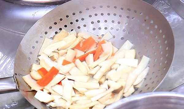 2.锅中烧开水,将牛肝菌和胡萝卜放入水中焯水2分钟,待牛肝菌碎后捞出沥干,迅速过冷水,入味更鲜嫩。