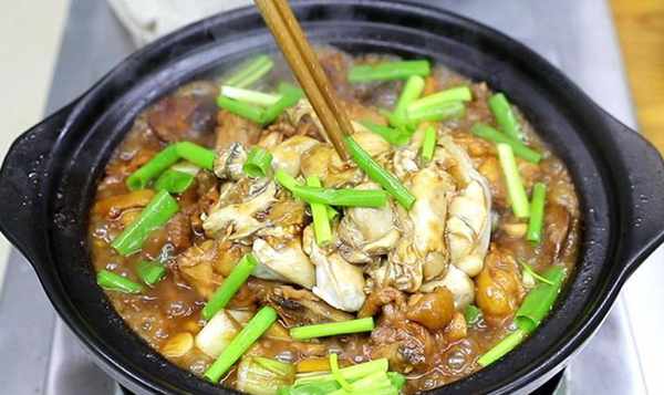 5.10分钟后,放入生蚝,盖上少许炖汁,盖上锅盖再炖2-3分钟,让鸡的香味、蚝油的鲜味和酱汁的咸香结合,撒上小葱,美味即成。