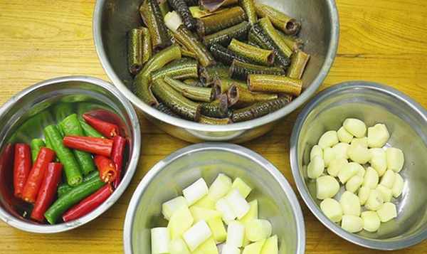 2.锅里烧很多油,等油温升到50%的时候,先把大蒜炒出蒜香,然后加入青红椒快速翻炒过油,这样方便便于后期快速油炸,还能保持鲜亮的色泽。