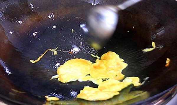 3、将蛋液倒入烧热的平底锅中放冷油,煎至蛋液完全凝固,用勺子打散倒出待用。
