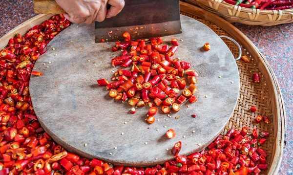 将新鲜辣椒洗净并晾干,去除茎和种子。将辣椒切碎,放入食品加工机中高速加工。