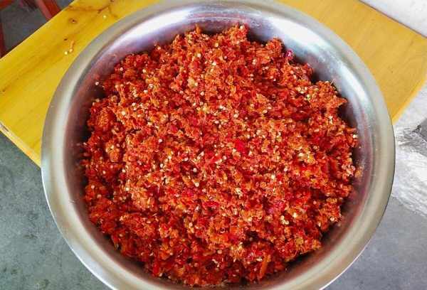 剁椒鱼头是一道非常典型的湘菜,其特点是使用了湖南特有的香料“剁椒”。剁辣椒酱是这道菜的重要调料之一。它是一种用辣椒、盐和花生油等配料制成的辣酱,可以为食物增添浓郁的风味。以下是制作辣椒酱的基本方法: