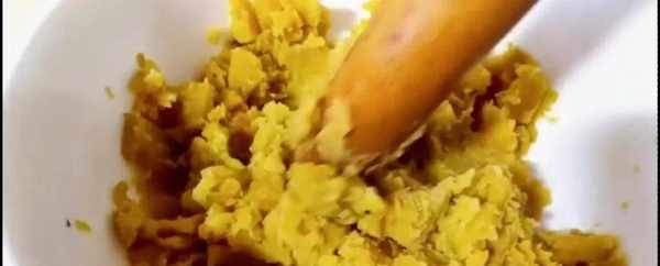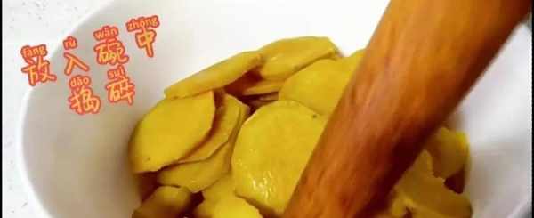 3将红薯片从烤箱中取出,将红薯片放入碗中捣碎。