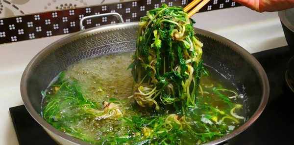 2、锅中放水,加入冰糖三到五块和食盐一汤匙,然后将水烧开,搅拌至糖溶化,加入漂白洗净的蒲公英,关火。火焰出现。'腐烂。水漂白1-2分钟。蒲公英捞出用冷开水浸泡片刻,然后挤干水分切碎备用。