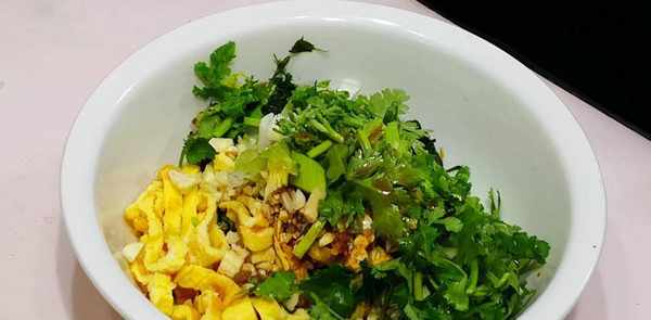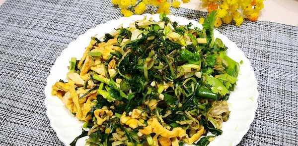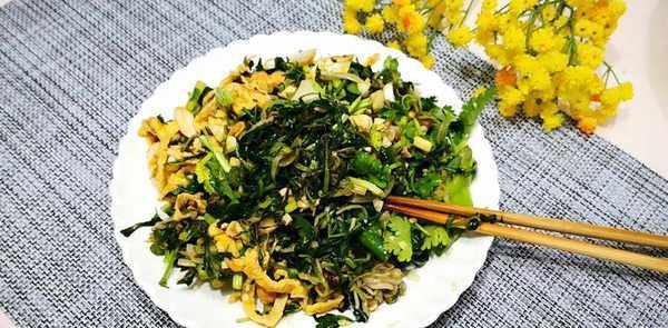 准备一个小碗,放入两个鸡蛋。为防止煎好的蛋卷发臭,加几滴米醋,拌匀,倒入放油的锅中,煎至两面焦黄,装盘晾干。不热,切碎备用。4、然后把所有的材料放在一起,再加入一勺盐,一勺白糖,两勺鲜味,少许米醋,几滴香油调味,拌匀装盘,这很美味!
