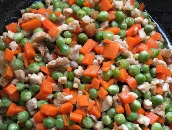 步骤4、油热,加入猪肉末快火滑炸,把肉末翻炒到变色,变白后放入胡萝卜丁、豌豆粒,迅速炒匀,加适量盐调味;