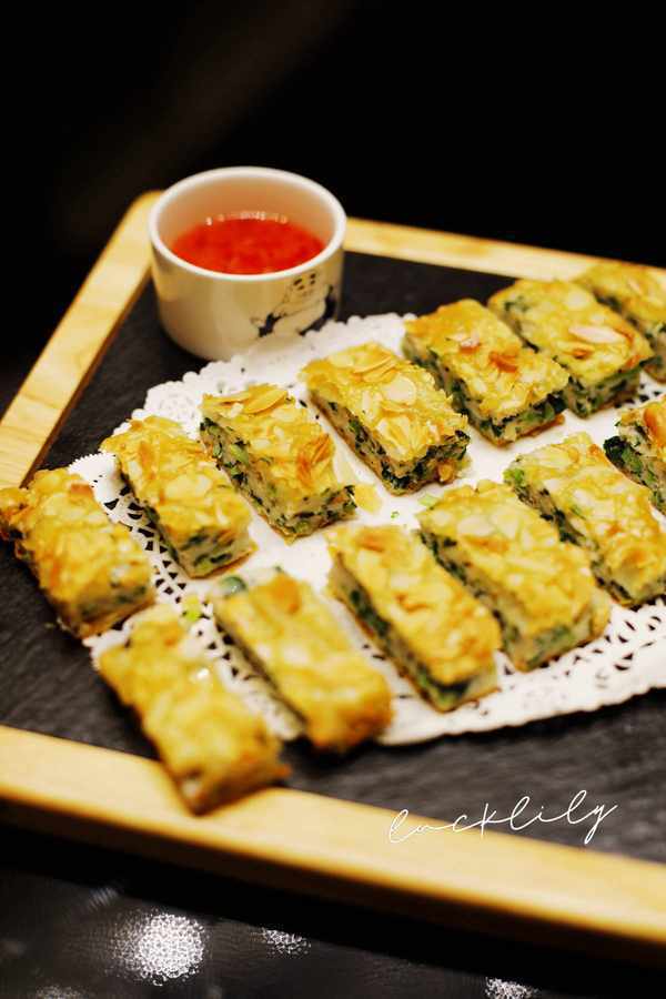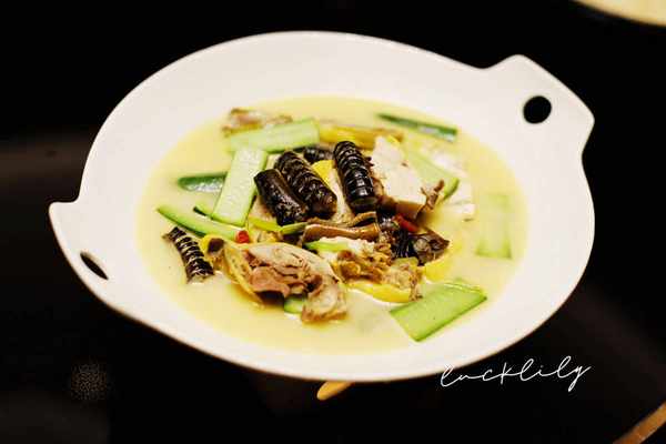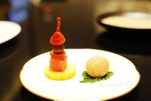 上桌时没人能猜出这是一道什么菜,更有点像似糕点,入口一辨,松露、百合、还有鸡脯肉,将咸菜做成了甜相,蘸上大厨秘调的酱汁,口味非常独特。