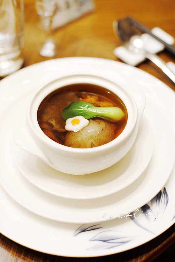 热菜头道是位上的笋干菜炖群边汤,这道热汤就具有鲜明的杭帮特色,儿时记忆中杭州人进补最喜欢的食材就是甲鱼、鳗鱼、黄鳝等,甲鱼基本都是排在第一位的,大块的甲鱼裙边说明取用的甲鱼生长得足有年份,咬下去胶质满满,而笋干菜经过腌制,本就是极好的汤料,自然出鲜,汤色澄亮,佐以青叶、海胆蛋白点缀自然是厨师的一番美意了。