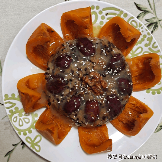 最后把芡汁浇在南瓜饭上,再撒些熟芝麻点缀,就可以食用了。