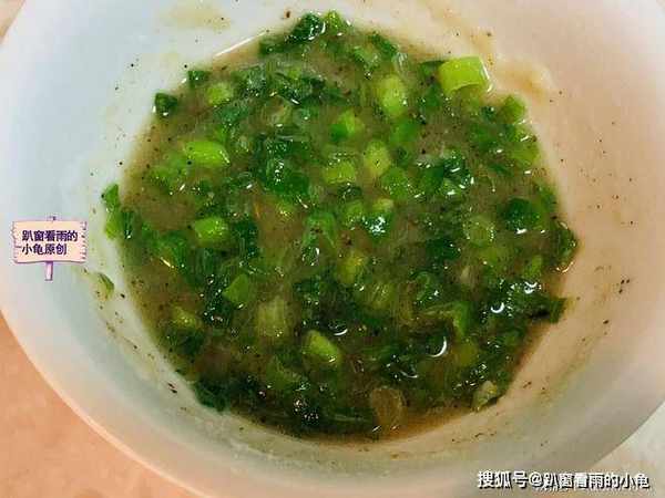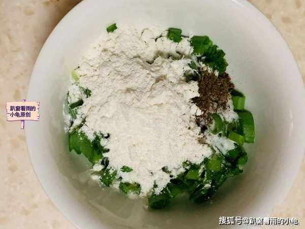 步骤2:将小葱洗净,切成葱花,放入小碗中。再加入两勺面粉、半小勺盐、半小勺花椒面,然后浇上热油,搅拌均匀成葱油酥备用。