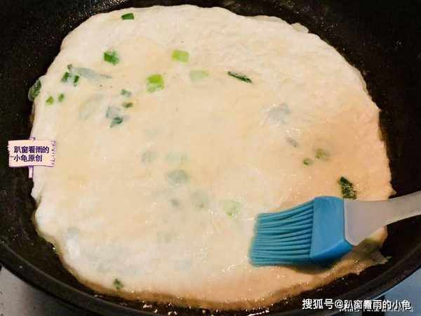 步骤6:火上坐平底锅(或者用电饼铛),锅热后刷薄油,然后放入饼胚,在饼的表面也刷一层薄油,以锁住饼的水分。