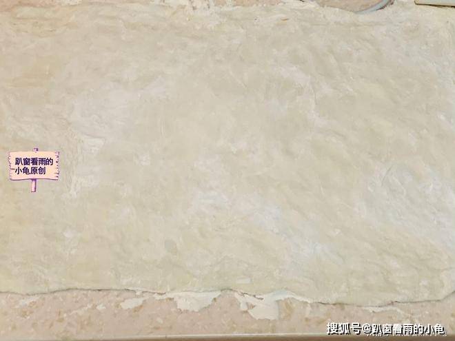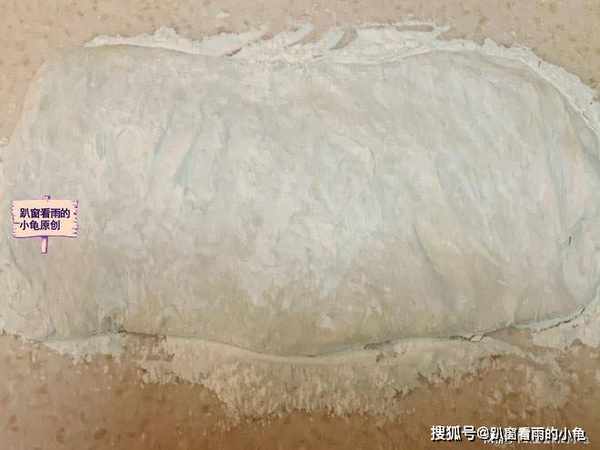 步骤3:在案板上撒上少许面粉,放上醒好的面糊团,在干面粉的帮助下用手将面糊团整理成长条,然后再用手按扁,再用擀面杖擀成长方形的大面片。