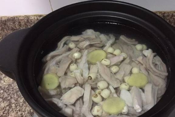 5、猪肚、莲子、骨头和姜片放入锅中加入量的水煮2小时。