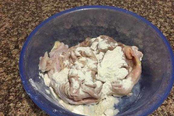 1、猪肚加入面粉不停的揉搓,揉搓5分钟左右清洗干净,再加入醋和盐各清洗一次,主要是去除猪肚里的胃液和腥味。