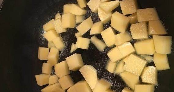 土豆去皮洗干净,切成小块下油锅煸炒,到表面金黄发焦。