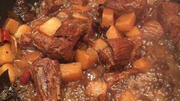 小火慢慢的熬,第一次水快完的时候加入酱油和土豆,然后再加少量的水小火慢炖15分钟。