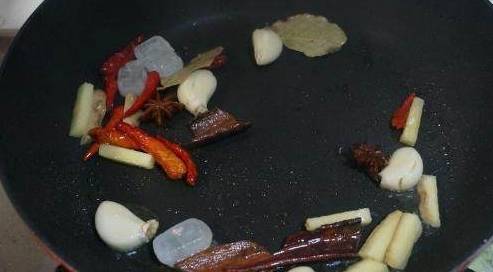 开始炒料,加入八角、香叶、桂皮、辣椒、蒜、姜、豆瓣酱爆香,然后倒入排骨,翻炒均匀以后加入适量的水。小火慢炖30分钟,里面的汤汁就变少了。