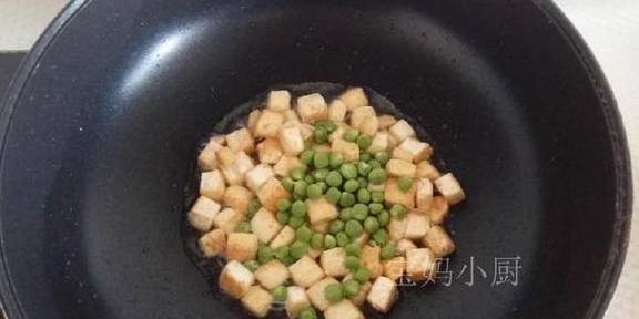 3炒锅加植物油,油温5成热,放入豆腐丁小火煸炒至表面发黄,加入豌豆翻炒,豌豆鼓胀,即可盛出备用