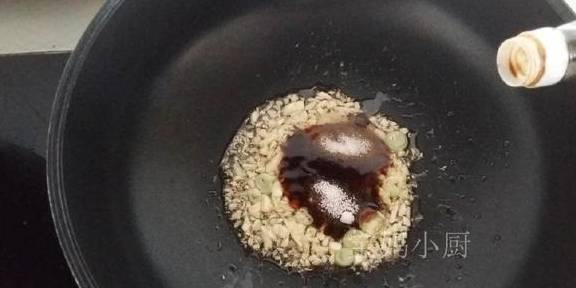 4利用锅内余油,下葱蒜末小火炒香,蒜末微微发黄,放入蚝油、酱油、白糖、盐