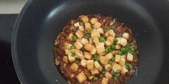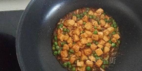 5放入豆腐丁和豌豆,加适量清水,开大火收汁
