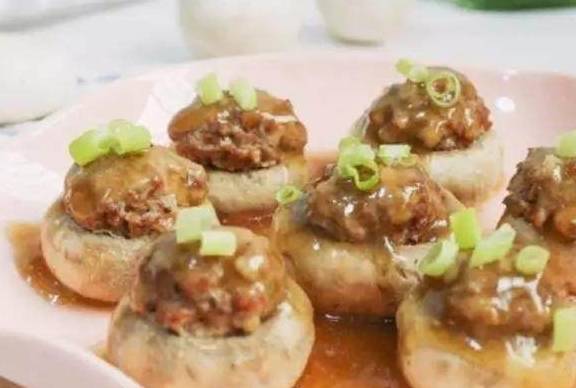 3蘑菇洗净,去根,往蘑菇里塞入适量肉馅,放入深一点盘子中。