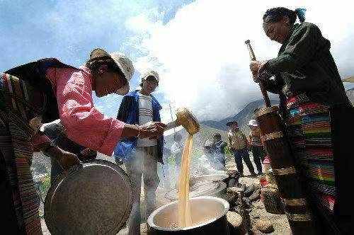 藏胞家如果进来一个陌生人,首先敬你一杯色泽淡黄、香气扑鼻的酥油茶;如果你是来做客,还要给你献上一条洁白的哈达。亲友出门门远行,一家人或全村人提着酥油茶前来送行,献上一条哈达,喝上三杯酥油茶,一路吉祥如意。