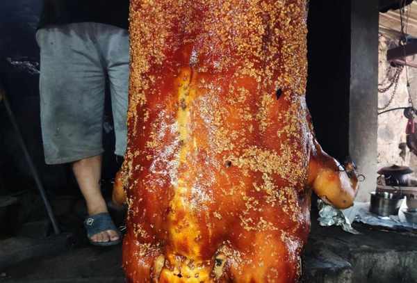 乐民烧肉的原料选用当地优质土猪,经各种秘制香料腌制,整猪烤制而成。烤猪色香味俱全,肉皮厚而不腻。