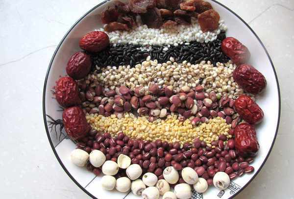 用料:紫米、糯米、小麦米、豌豆、去皮绿豆、红豆、红枣、桂圆、莲子。