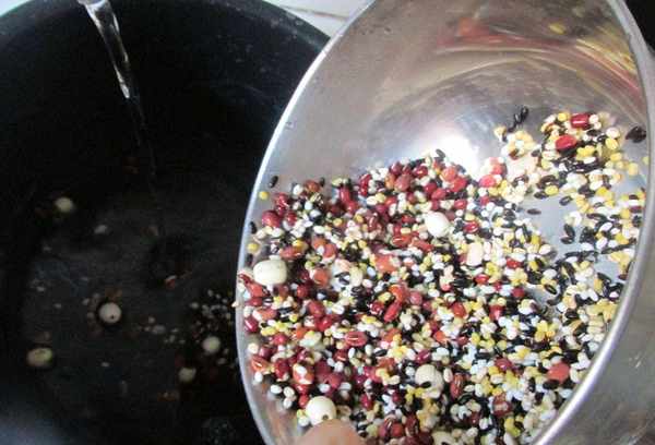 第三步:将电饭煲洗净,加水,将洗净的杂粮倒入,选择煮粥键。