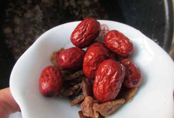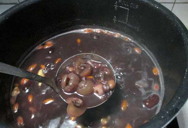 第四步:加入红枣和桂圆干。煮好后,电饭煲会发出滴滴声,可以煮饭了。