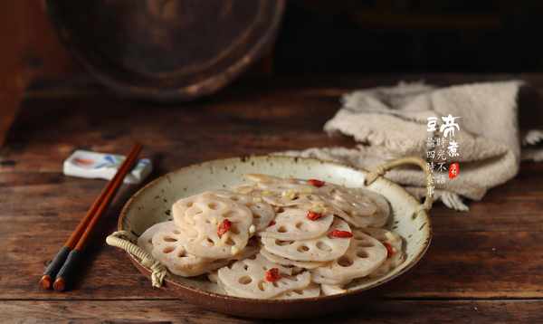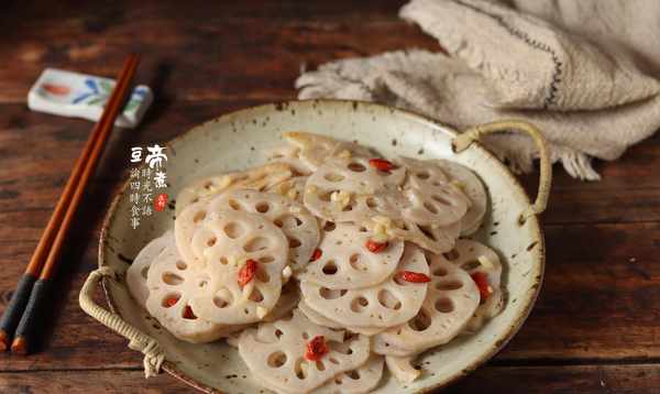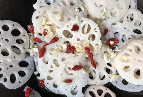 材料:藕1根、枸杞1撮、蒜2瓣、盐1茶匙