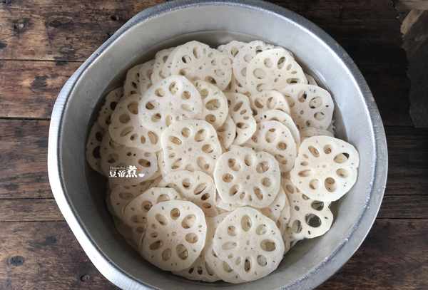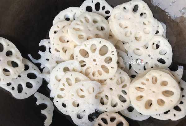 3、莲藕刮去外皮,切成薄片,泡水,洗三遍,去掉表面的淀粉。