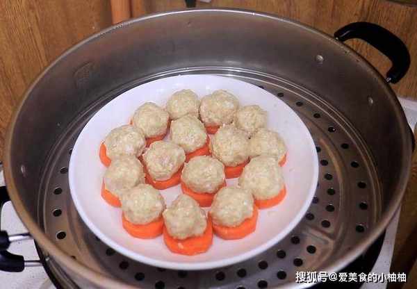 5.抓适量的馅料在手心里团成圆球,馅料比较黏手可以在手上沾点清水,把团好的丸子摆放在胡萝卜片上面。锅中烧开水,水烧开以后放入准备好的丸子,中火蒸15分钟就可以了。