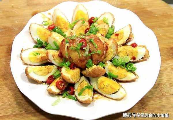 4.20分钟以后鸡蛋表面已经起满虎皮斑,切成均匀的小块摆放在盘中,均匀浇上调好的料汁,再撒上一层葱花,美味即成。